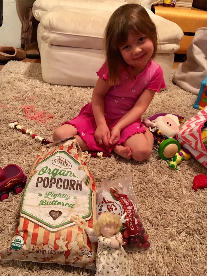 Last night we busied ourself with a fire-side cranberry/popcorn wreath. R loves using a needle to sew, so this was a perfect activity (although I’m slightly worried about K getting her hands on all the cranberries that no doubt made their way into secret hiding spots on the floor and deep carpet).