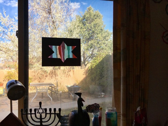 Once I had kiddos of my own to play with during the winter holidays, I dove head first into a Pinterest hunt for fun, age-appropriate craft ideas. We’ve done a lot of salt dough ornaments, marshmallow dreidels, popsicle stick menorahs, paper menorahs, finger/hand painted menorahs, and popsicle stick stars of David. Tonight we might even venture into the world of pasta menorahs — you know, using 9 penne noodles and a lasagna noodle for the base. My favorite Chanukkah craft though, which I keep up year round in the playroom, is a faux stained glass star of David, made by cutting out a star shape in a black piece of construction paper and letting R glue strips of tissue paper across the void.