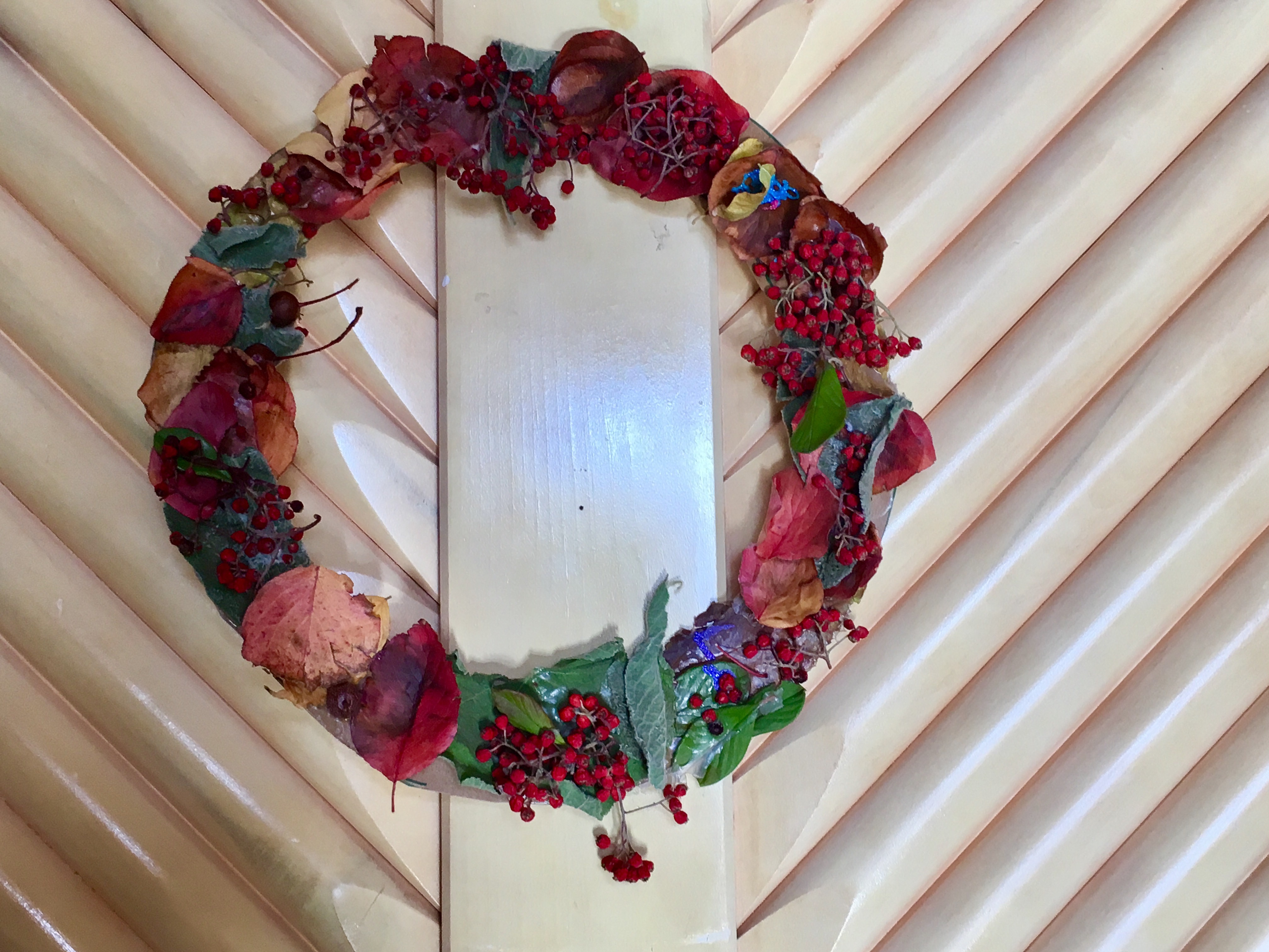 Our wreath also turned out beautifully this year, and was fashioned out of an old pizza box cut into an open circle. R and I had fun scouring our backyard for different types of leaves and berries, some of which we examined under R’s new microscope before they were arranged and glued onto the cardboard.