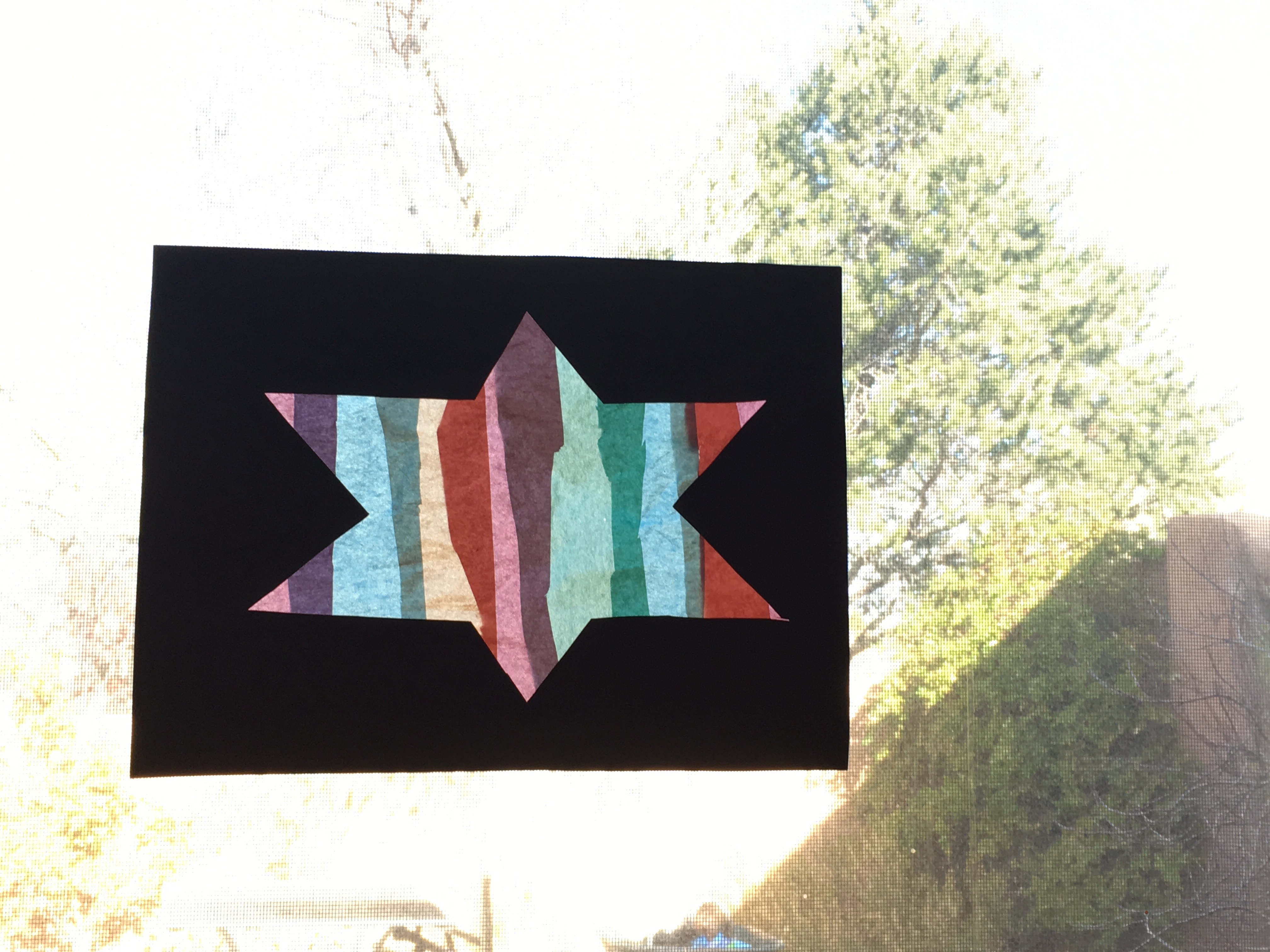 Once I had kiddos of my own to play with during the winter holidays, I dove head first into a Pinterest hunt for fun, age-appropriate craft ideas. We’ve done a lot of salt dough ornaments, marshmallow dreidels, popsicle stick menorahs, paper menorahs, finger/hand painted menorahs, and popsicle stick stars of David. Tonight we might even venture into the world of pasta menorahs — you know, using 9 penne noodles and a lasagna noodle for the base. My favorite Chanukkah craft though, which I keep up year round in the playroom, is a faux stained glass star of David, made by cutting out a star shape in a black piece of construction paper and letting R glue strips of tissue paper across the void.